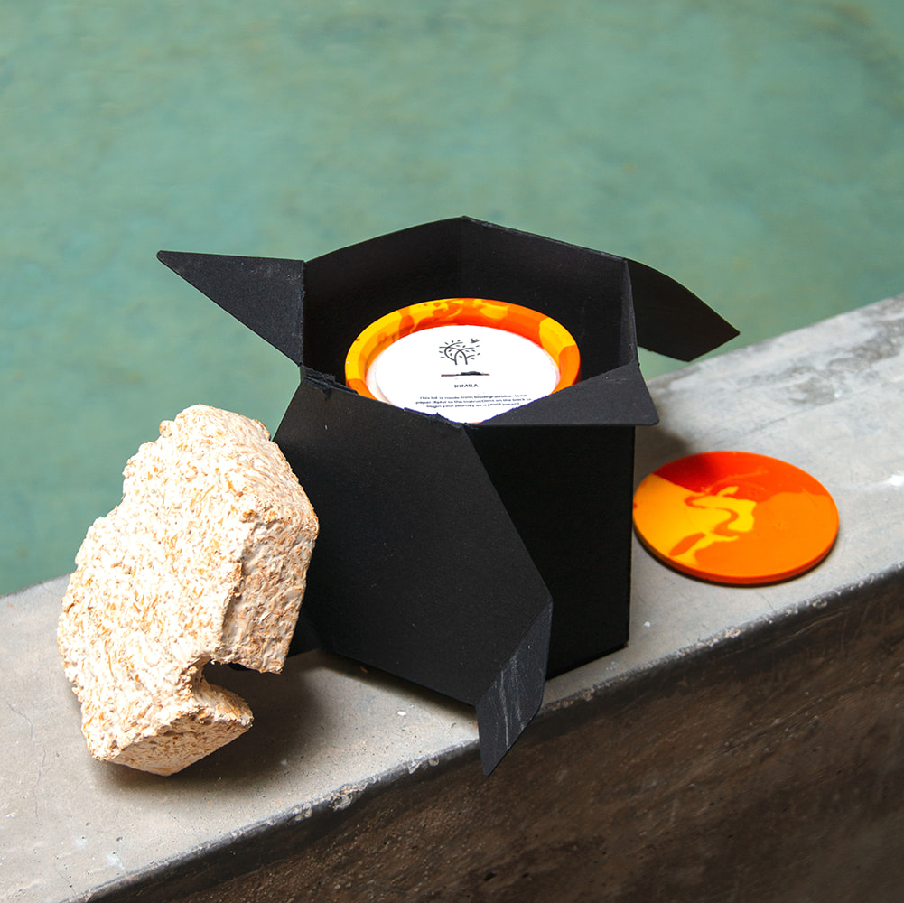 "Our carbon-negative packaging saves water & trees. We use tree-free paper from cotton rag waste and mycelium mushroom packaging (grown in just 7 days) as an alternative to styrofoam and bubblewrap.